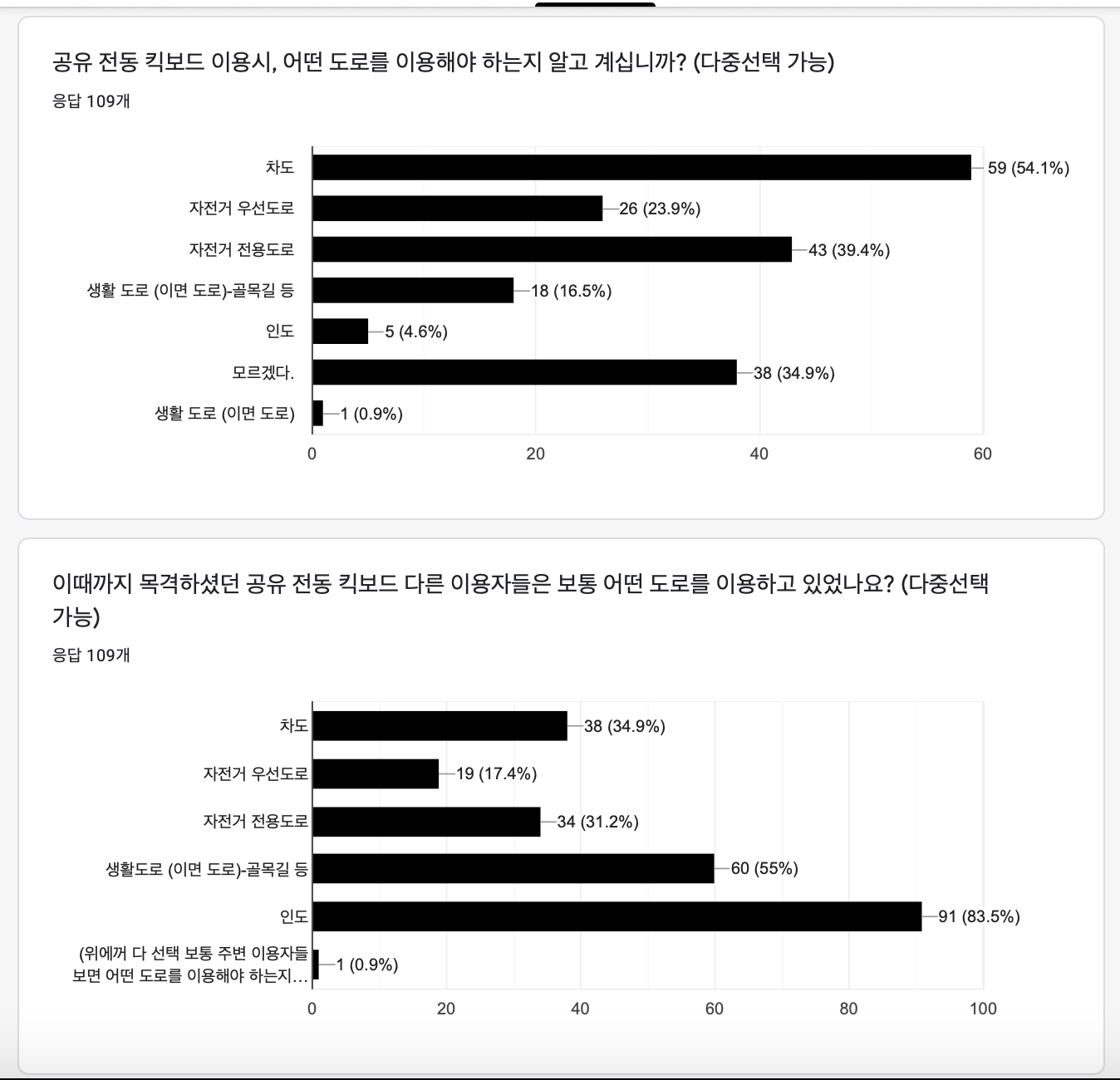 2.이때까지 목격하셨던 공유 전동 킥보드 다른 이용자들은 보통 어떤 도로를 이용하고 있었나요? (다중선택 가능)