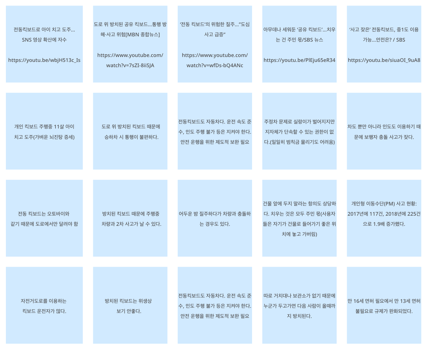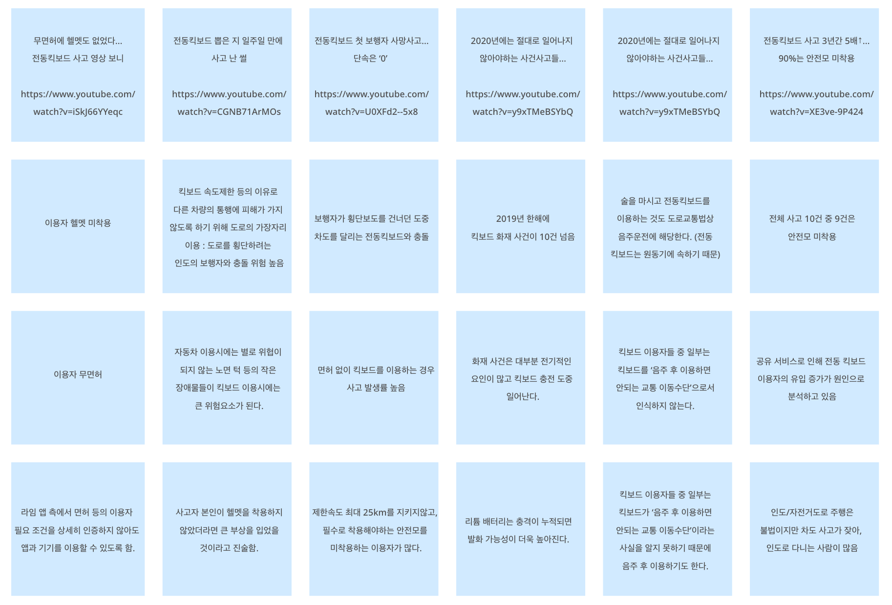 how: 유튜브에서 '전동 킥보드 사고'를 검색한 후 나온 영상 자료들의 사고원인과 사고 유책인 등을 분석함. 댓글들 중 가장 공감 반응이 높은 댓글 5가지를 수집함.