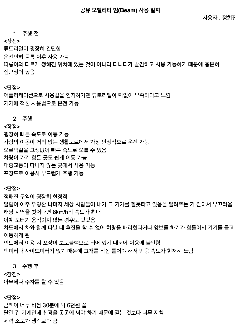 https://www.youtube.com/watch?v=iSkJ66YYeqc https://www.youtube.com/watch?v=CGNB71ArMOs https://www.youtube.com/watch?v=U0XFd2--5x8 https://www.youtube.com/watch?v=y9xTMeBSYbQ https://www.youtube.com/watch?v=XE3ve-9P424 https://www.youtube.com/watch?v=wfDs-bQ4ANc https://youtu.be/PlEju65eR34 https://youtu.be/siuaOI_9uA8 - 사용 일지 why: 서비스를 직접 경험하고 문제점을 파악하기 위해 how: 일반 도로에서 공유 킥보드를 빌려 직접 타보기 who: 조사자 2명 what: 조사자들의 경험을 리서치를 통해 발견한 사용자 경험과 비교