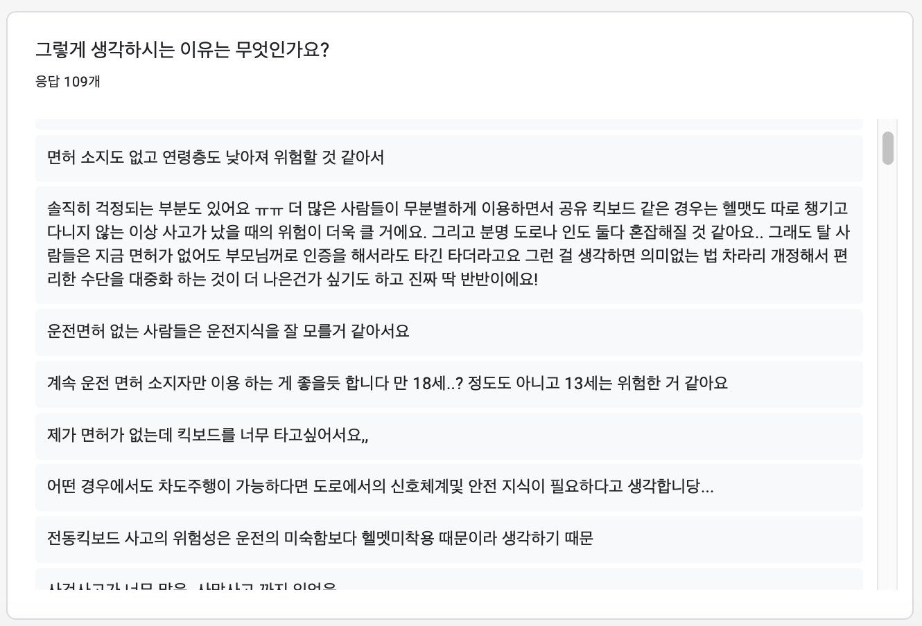what: '2020년 말부터 만 13세 이상이라면 면허를 소지하지 않아도 전동 킥보드 운전이 가능해짐'에 대한 사용자들의 의견 - 데스크리서치